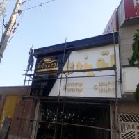 زمینه ورق کامپوزیت سفید و مشکی - بصورت پله ای و یکپارچه - حروف استیل زیرکار دوغی - ابعاد 8 * 4 متر - نور آفتابی
